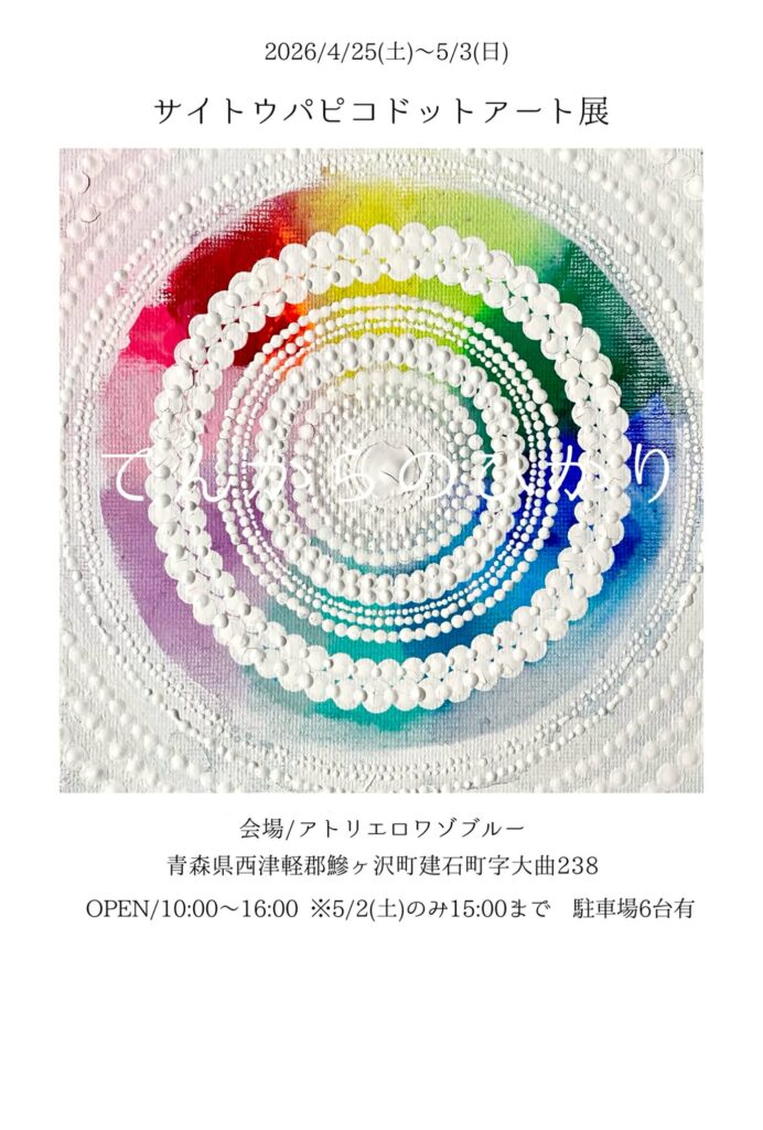 2026年4月25日 / 最終更新日時 : 2026年4月25日 Saki.1103 NEWS ドットアート展「てんからのひかり」開催中 忘れてました。 今日からです。 サイトウパピコドットアート展 【てんからのひかり】vol.1 〈日時〉 2026/4/25(土)~5/3(日) 10:00~16:00 ※5/2(土)のみ15:00まで 〈場所〉 アトリエロワゾブルー 青森県西津軽郡鰺ヶ沢町建石町字大曲238 駐車場6台有 入場無料